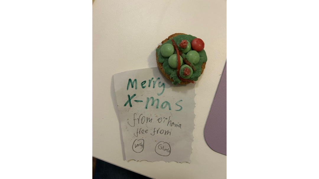 It would be easy for me to simply comment on our vivid exhibitions (see Mulch, above) and the energy of the Freshly Squeezed scratch nights of new theatre writing. Perhaps, on top of this, the arts at St Margaret’s House can be best illustrated by hearing the gentle chatter and giggles from participants at Kantha Embroidery – a free programme for local people to learn the heritage craft from Bangladesh – on a Friday morning in The Create Place, our making studio. Perhaps it can also be defined by the whole office coming together to gather plenty of charcoal for a weekend art workshop for local residents to explore health research from their perspective, or, personally, by the delivery of a special gluten-free cookie for me from a Crafterschool participant, an afterschool programme for local children (below – name removed).